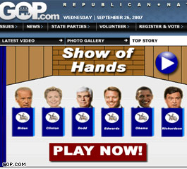 The ads direct Web users to an online game called "Show of Hands" which asks such questions as "Who Voted For The Largest Tax Increase In U.S. History?" and "Who Has Only Passed One Bill In The U.S. Senate, Which Dealt With The Congo?"