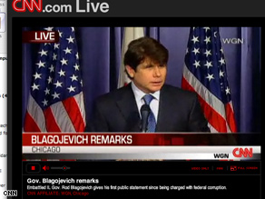 [cnn-photo-caption image= http://i2.cdn.turner.com/cnn/2008/images/12/19/art.blagojevich3.cnn.jpg caption="Watch Rod Blagojevich respond to his arrest on cnn.com/live."](CNN) - Embattled Illinois Gov. Rod Blagojevich is making his first public statement since his arrest on corruption charges.