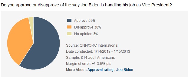 The Vice President's approval rating stands at 59%, with 38% saying they disapprove of the job he is doing. Biden's approval rating is up five points from last month. Besides leading the task force on curbing gun violence, Biden also had a high profile role, along with Senate Republican Leader Mitch McConnell, in striking a deal that temporarily averted the country going over the fiscal cliff.